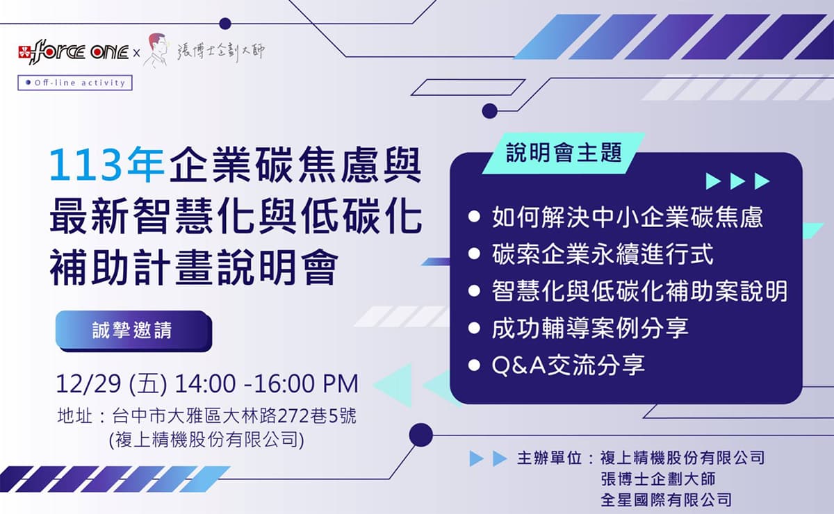 想知道申请政府计画拿补助不用还吗❓本次会议主要是分享如何解决中小企业碳焦虑以及113年最新智能化与低碳化补助计画,