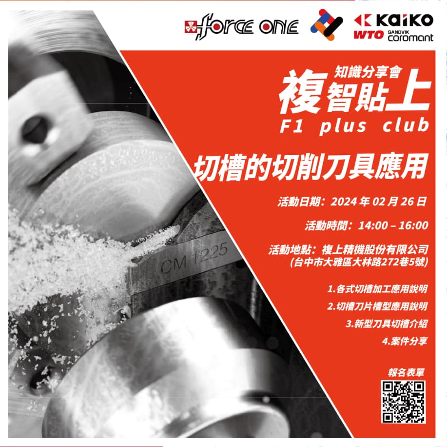 【切槽的切削刀具应用】课程大纲:1各式切槽加工应用说明2.切槽刀片槽型应用说明3.新型刀具切槽介绍 4.加工实例案件分享
