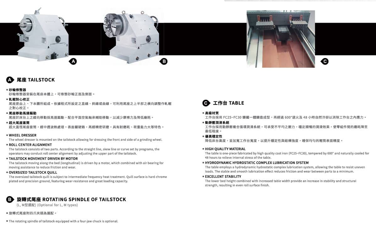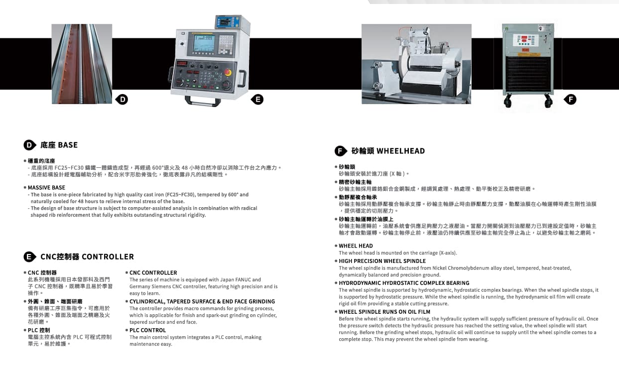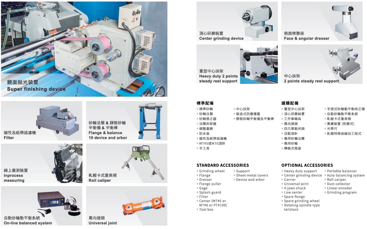砂輪主軸軸承採用動靜壓複合支撐系統,確保穩定性。
